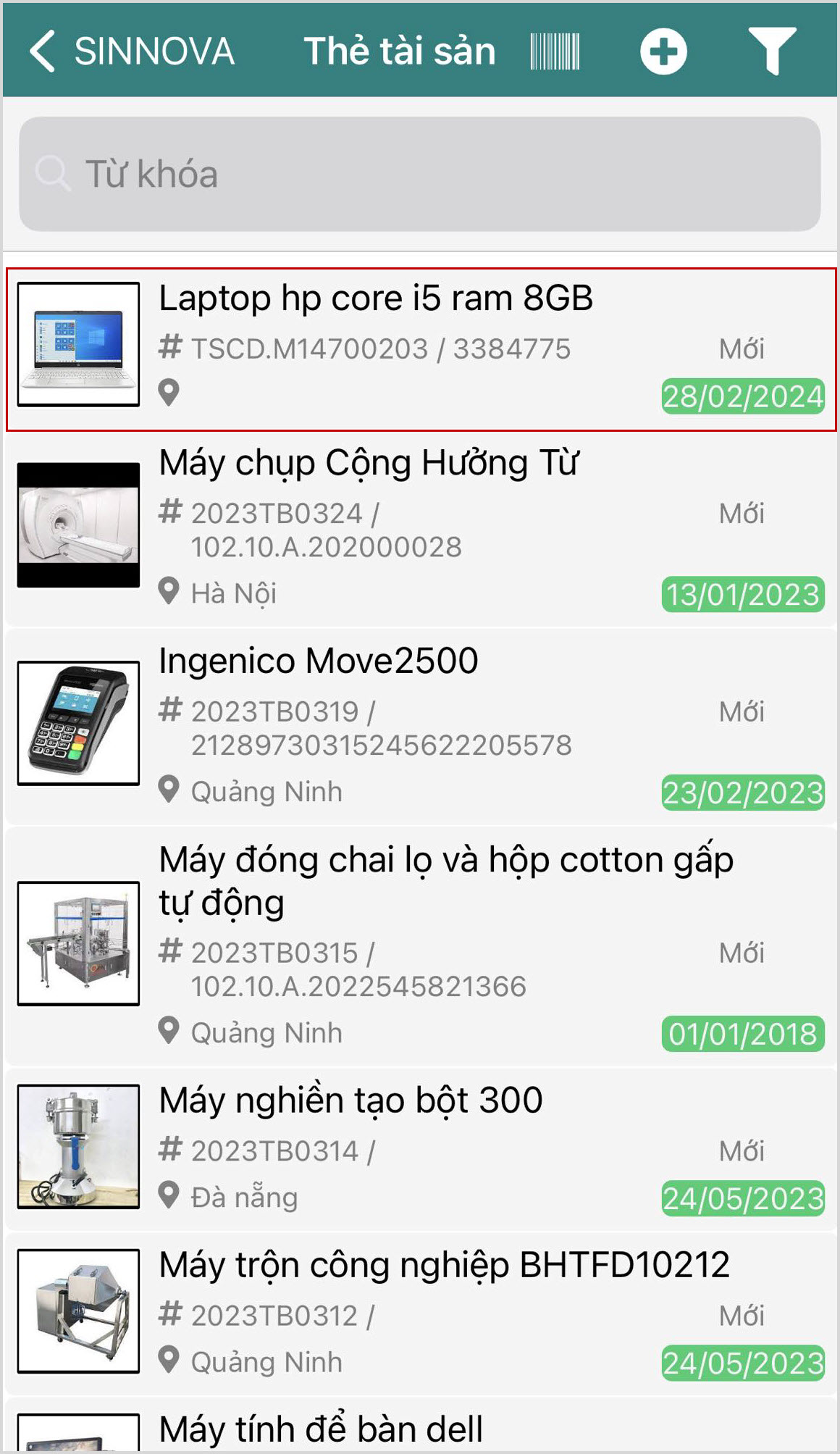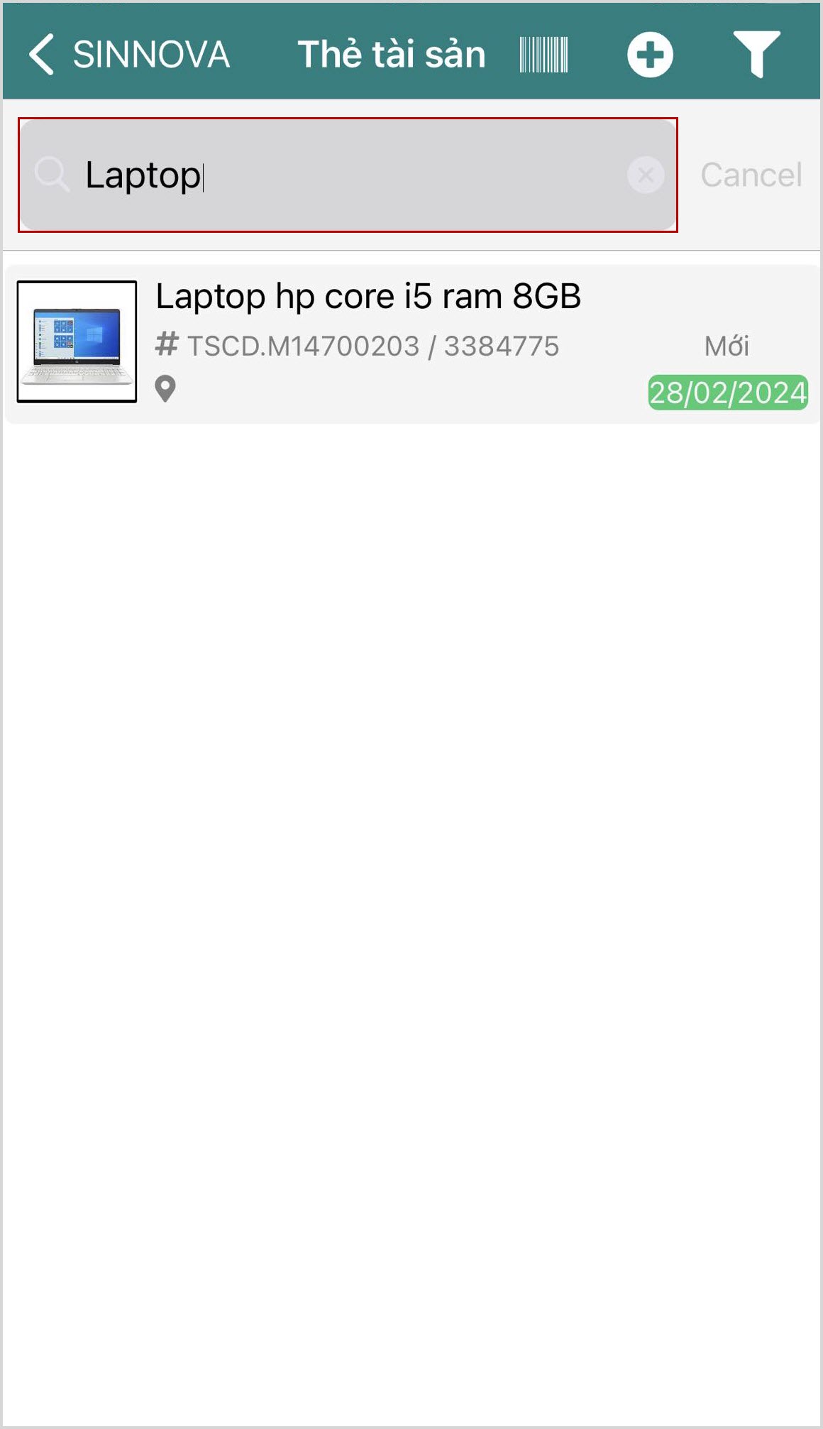 Tìm kiếm theo từ khóa: Nhập tên hoặc mã tài sản cần tìm kiếm.