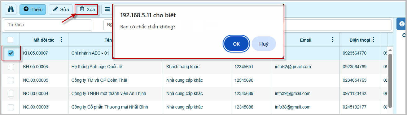 3. Chọn bản ghi "Đối tác" muốn xóa.