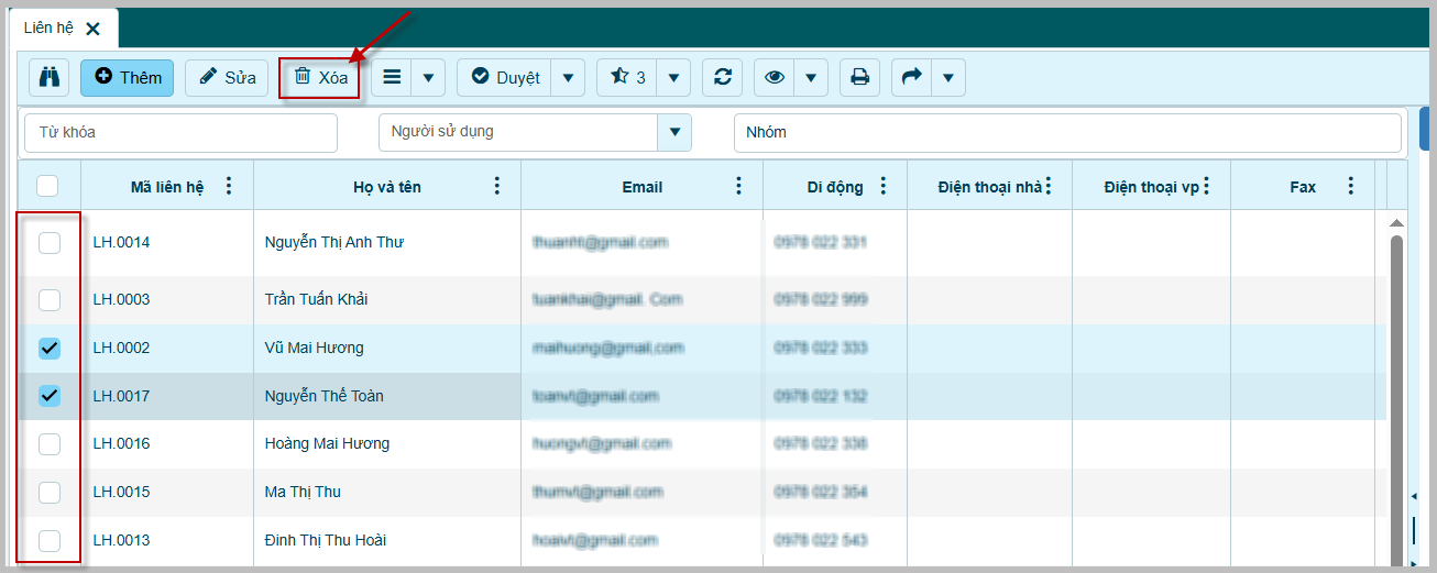 2. Nhấn chọn bản ghi "Liên hệ" muốn xóa.