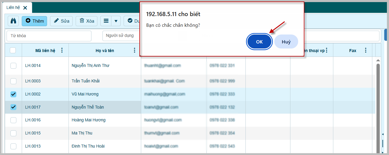 - Cách 2: Chọn nhiều bản ghi cần xóa bằng cách check chọn ô vuông đầu mỗi dòng.