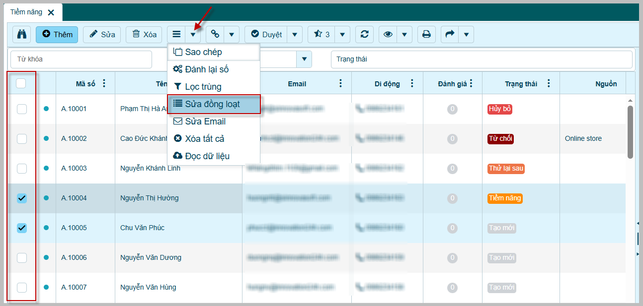 2. Tích chọn các khách hàng tiềm năng muốn chỉnh sửa thông tin, nhấn chọn tiện ích "Sửa đồng loạt".