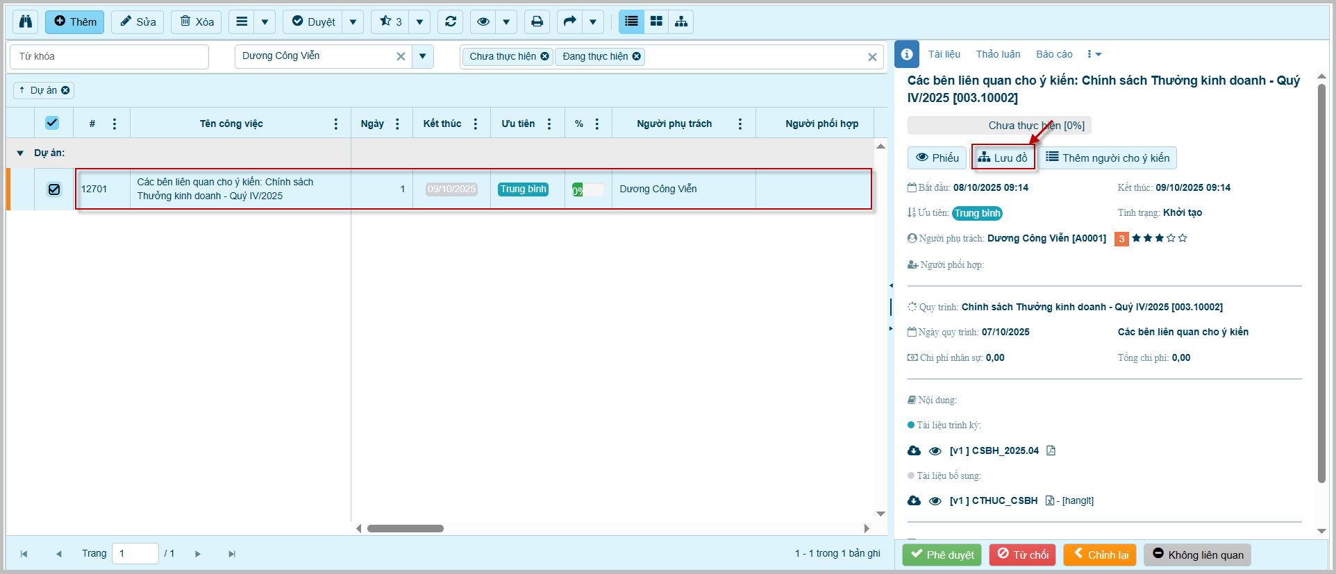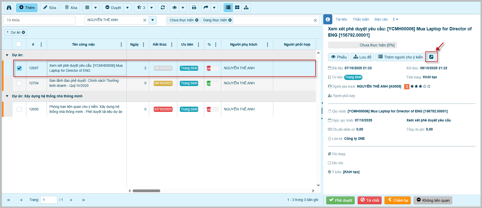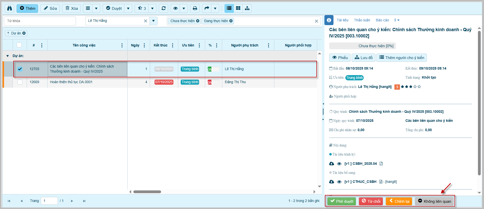 2. Chọn công việc, nhấn "Phê duyệt/ Từ chối/ Không liên quan/ Chỉnh lại" để phê duyệt quy trình.