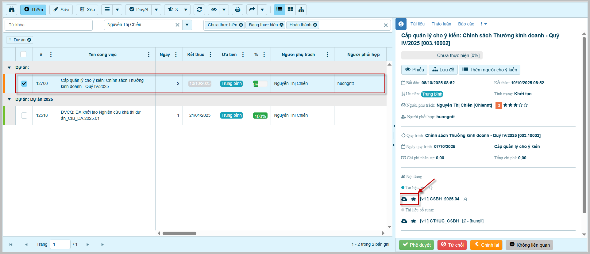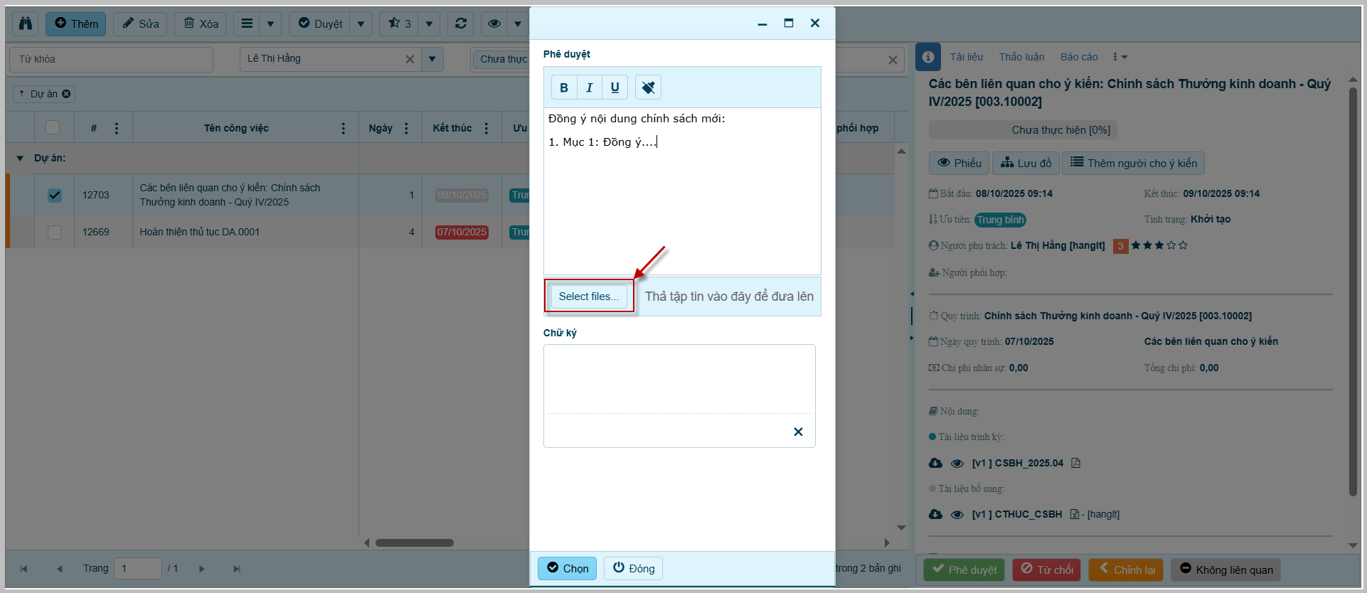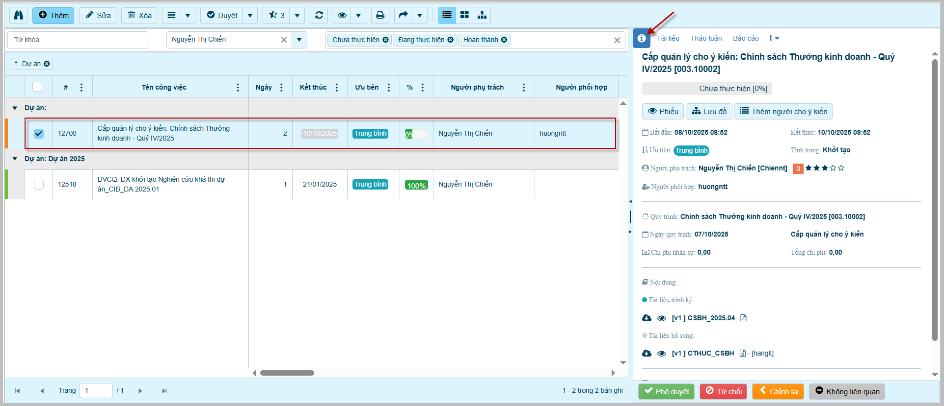 2. Chọn công việc, nhấn "Phê duyệt/ Từ chối/ Không liên quan/ Chỉnh lại" để phê duyệt quy trình.