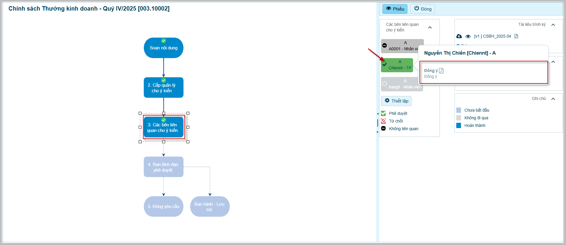 3. Chọn bước xử lý cần xem ý kiến, chọn box người sử dụng để xem ý kiến phê duyệt.