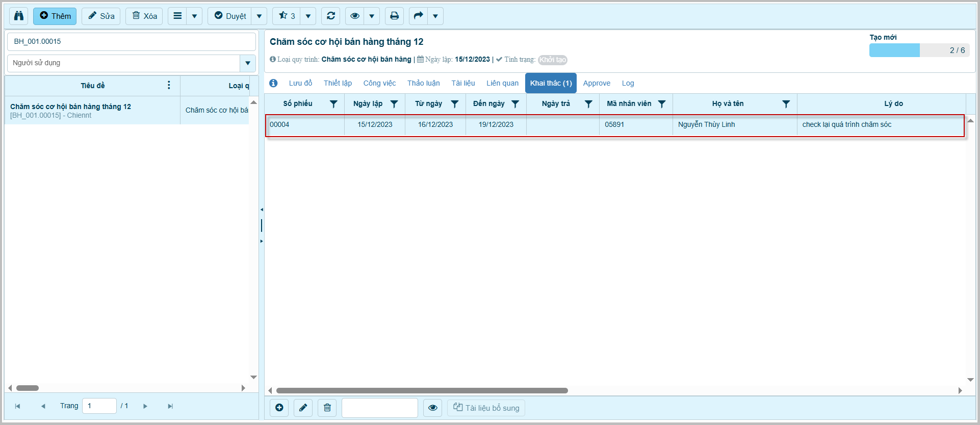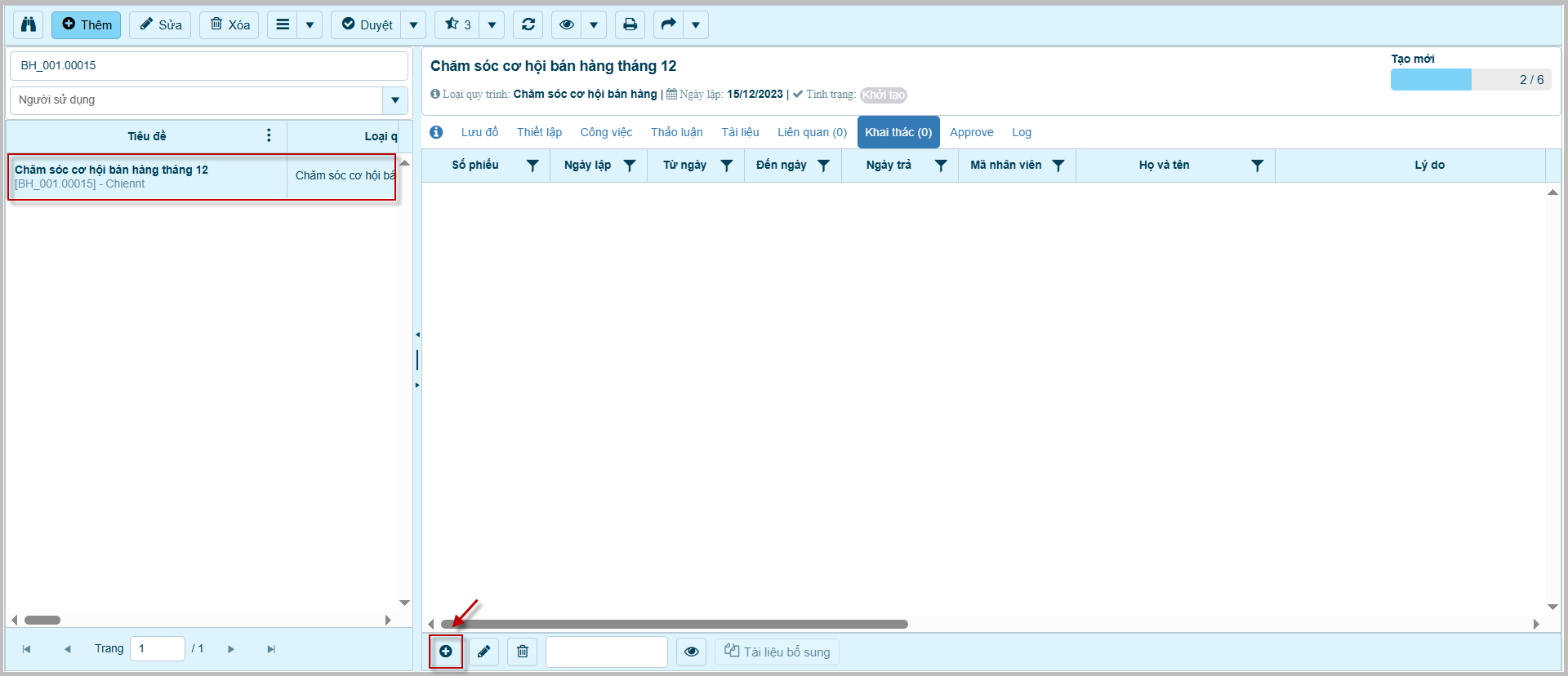 2. Chọn bản ghi quy trình cần thêm mới thông tin khai thác.