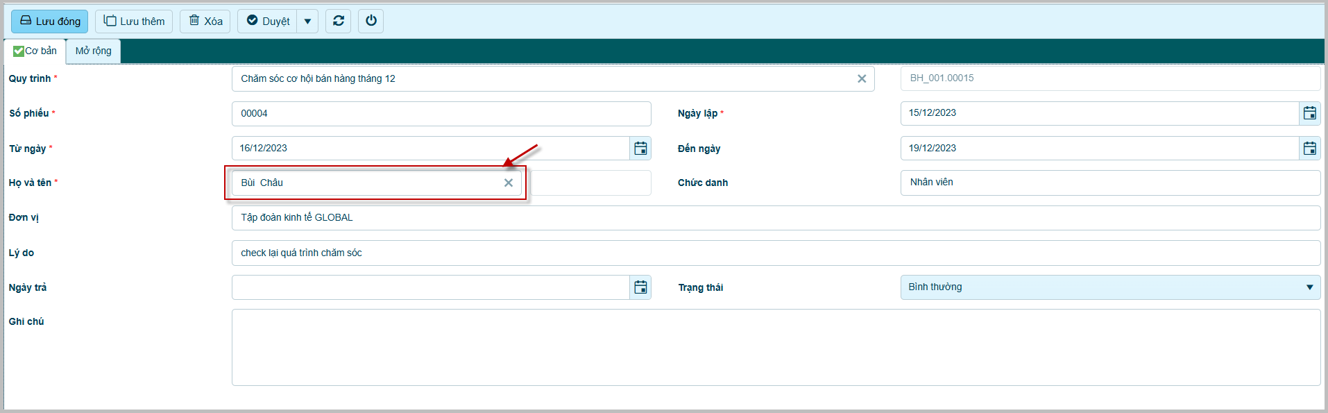 4. Cập nhật các thông tin: Quy trình, số phiếu,...