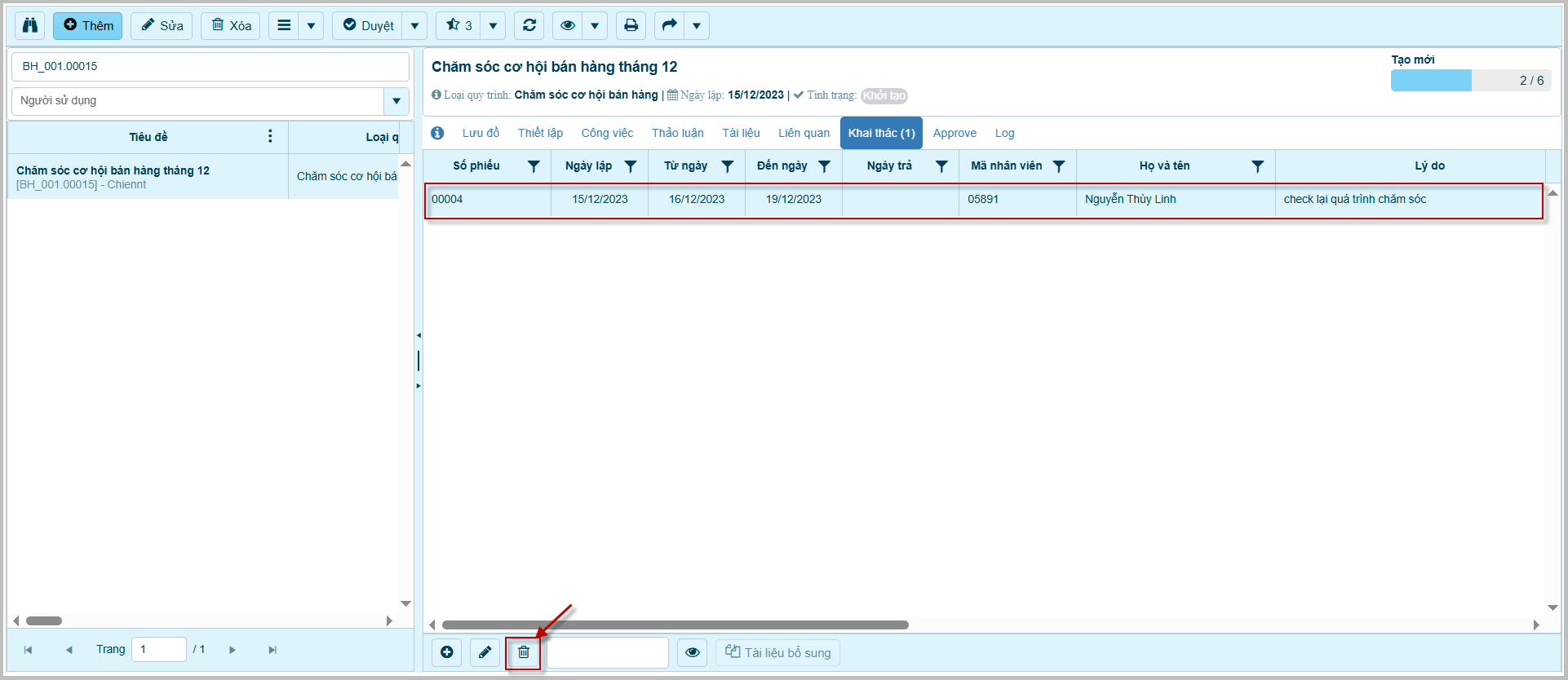 2. Chọn bản ghi quy trình cần xóa thông tin khai thác.