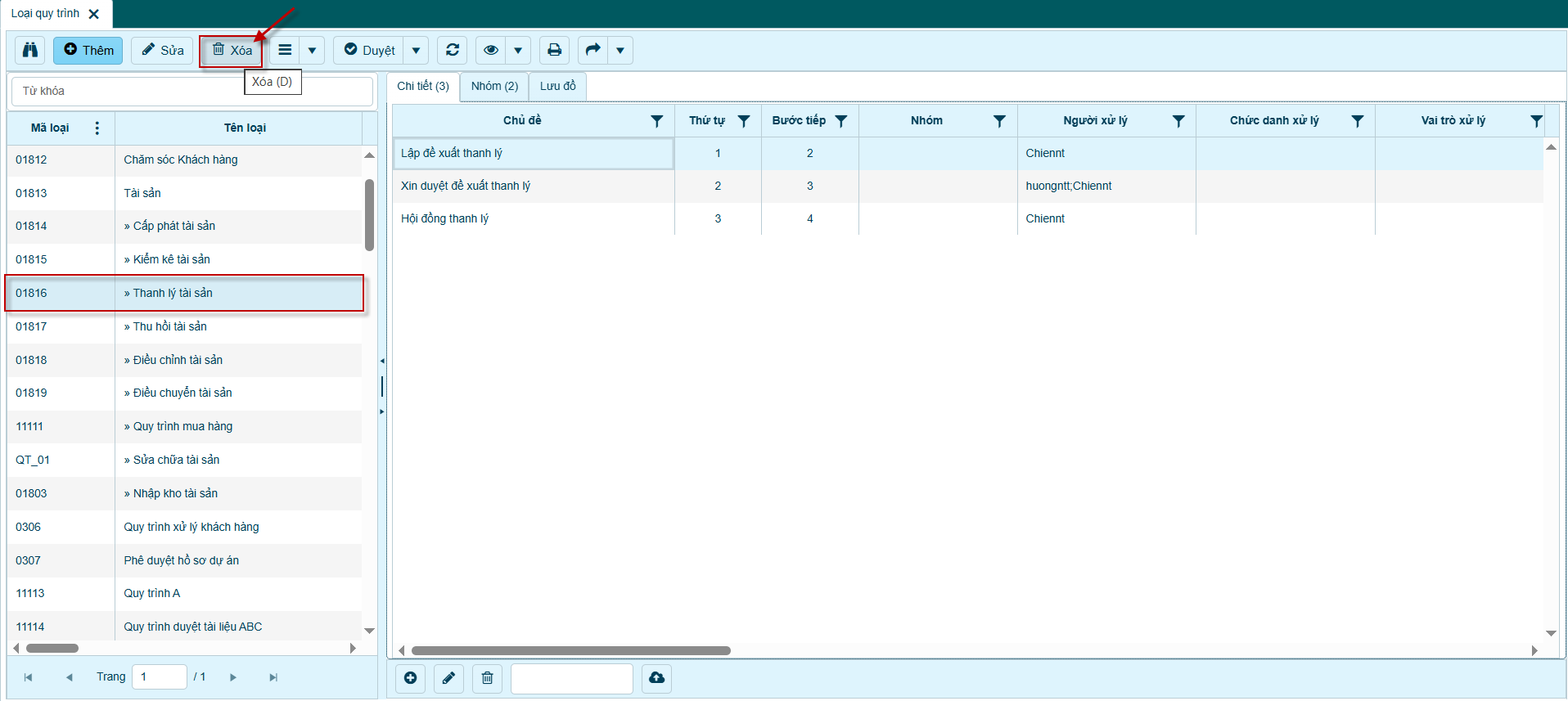 2. Chọn bản ghi "Loại quy trình" muốn xóa.